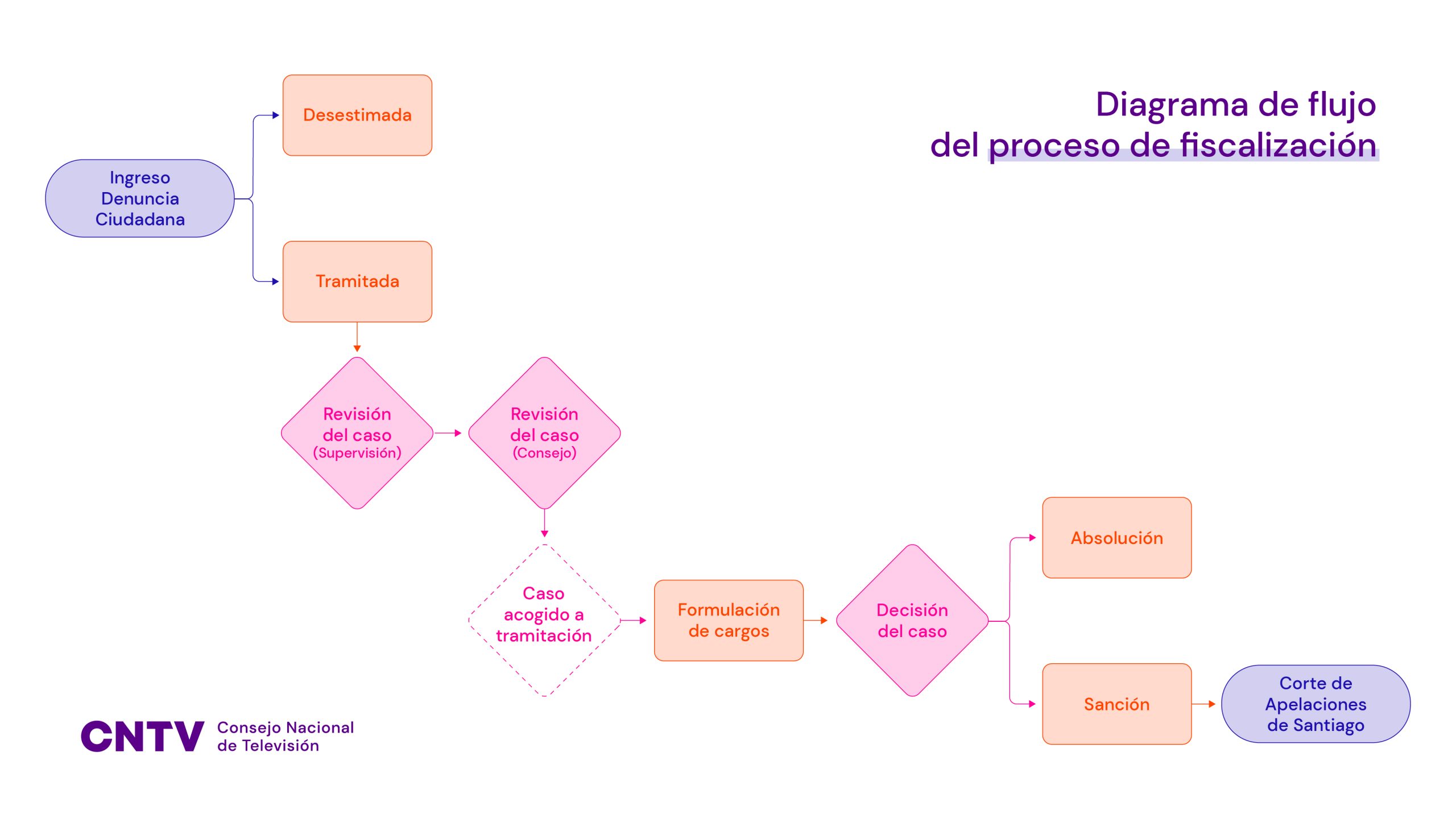 De manera resumida y esquemática, las fases del proceso de fiscalización del CNTV son tres. El proceso se inicia con la recepción de denuncias o bien con la decisión del Consejo de actuar de oficio. A continuación, se inicia el siguiente proceso: