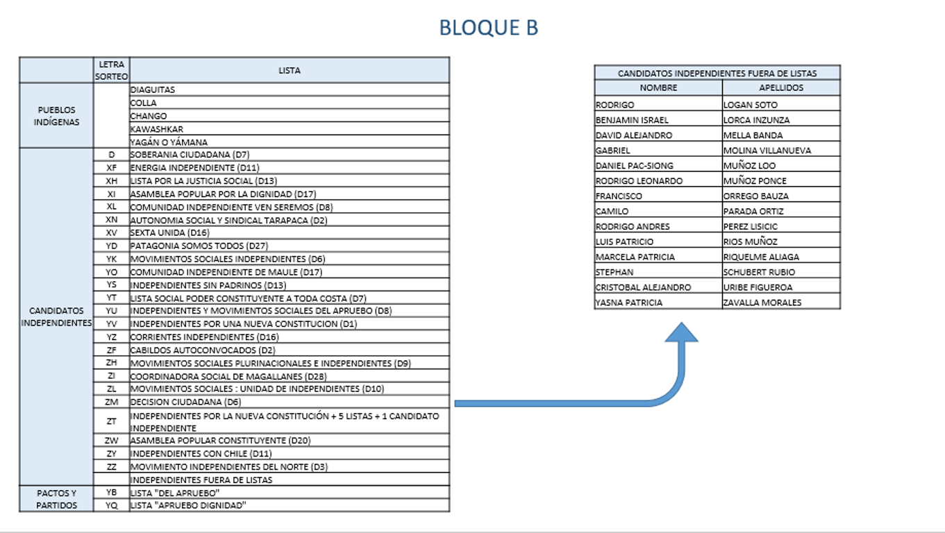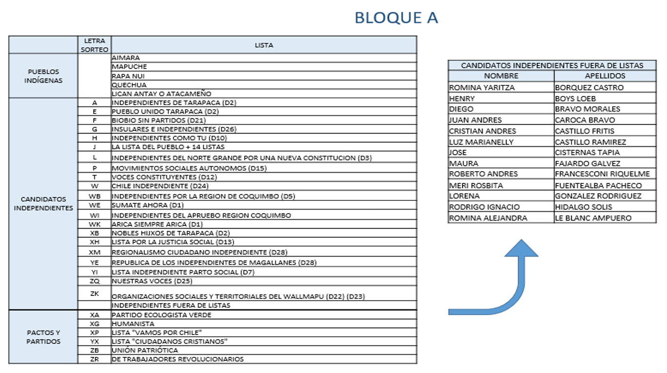 Cada bloque incluye pactos y partidos políticos, candidaturas de pueblos indígenas y candidaturas constituyentes.