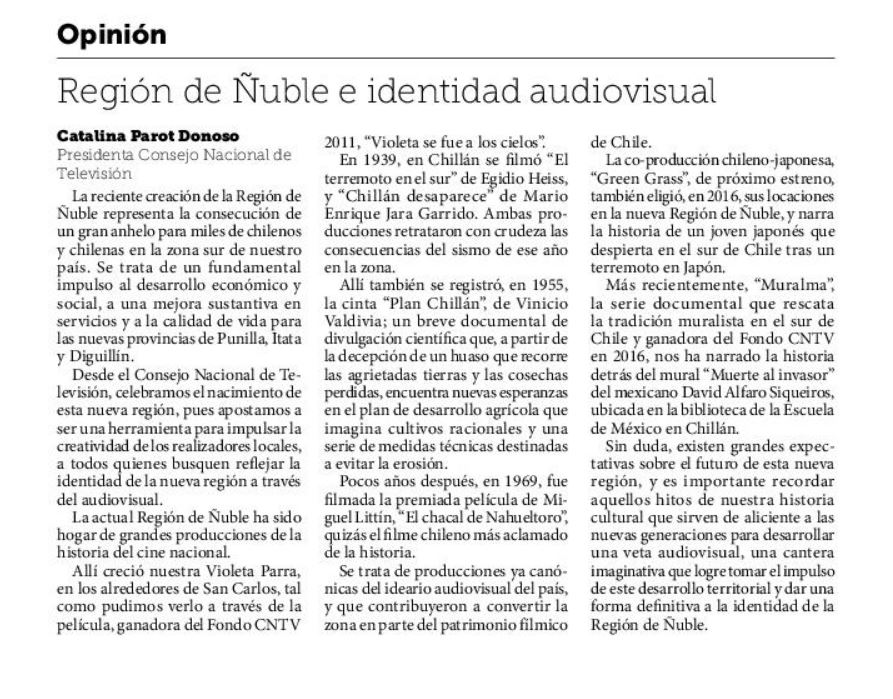 Columna de la presidenta del Consejo Nacional de Televisión, Catalina Parot, publicada en el diario La Discusión de Chillán, el día sábado 22 de septiembre de 2018.