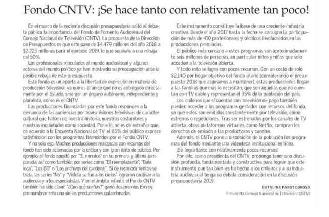 Columna Presidenta Catalina Parot en El Mercurio: «Fondo CNTV: ¡Se hace tanto con relativamente tan poco!»