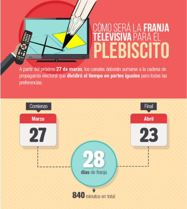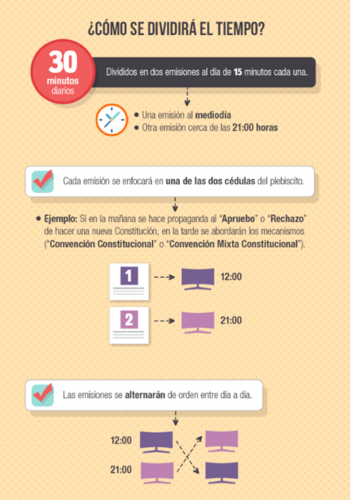 Casi 30 días de propaganda tendrán las opciones que dirimirán si se modifica o no la actual constitución que rige en el país, y bajo qué sistema hacerlo. Revisa en esta infografía los detalles de su transmisión.