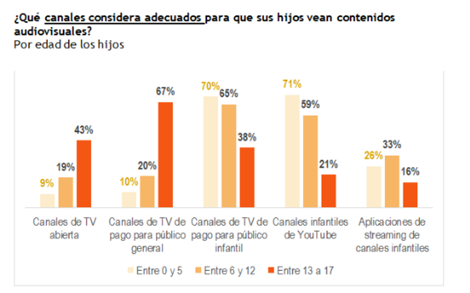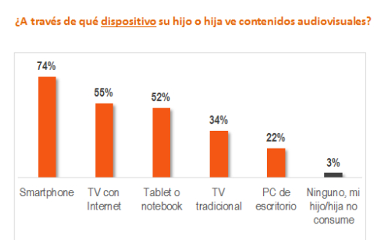 «Hoy gran parte de la audiencia infantil y adolescente ve contenidos audiovisuales en dispositivos distintos al televisor tradicional: el 74% de los padres señala que sus hijos la ven por smartphones, (mientras) un 55% dice que lo hacen a través de televisión con internet y un 52% en el tablet o notebook», se lee en una de las conclusiones del informe.