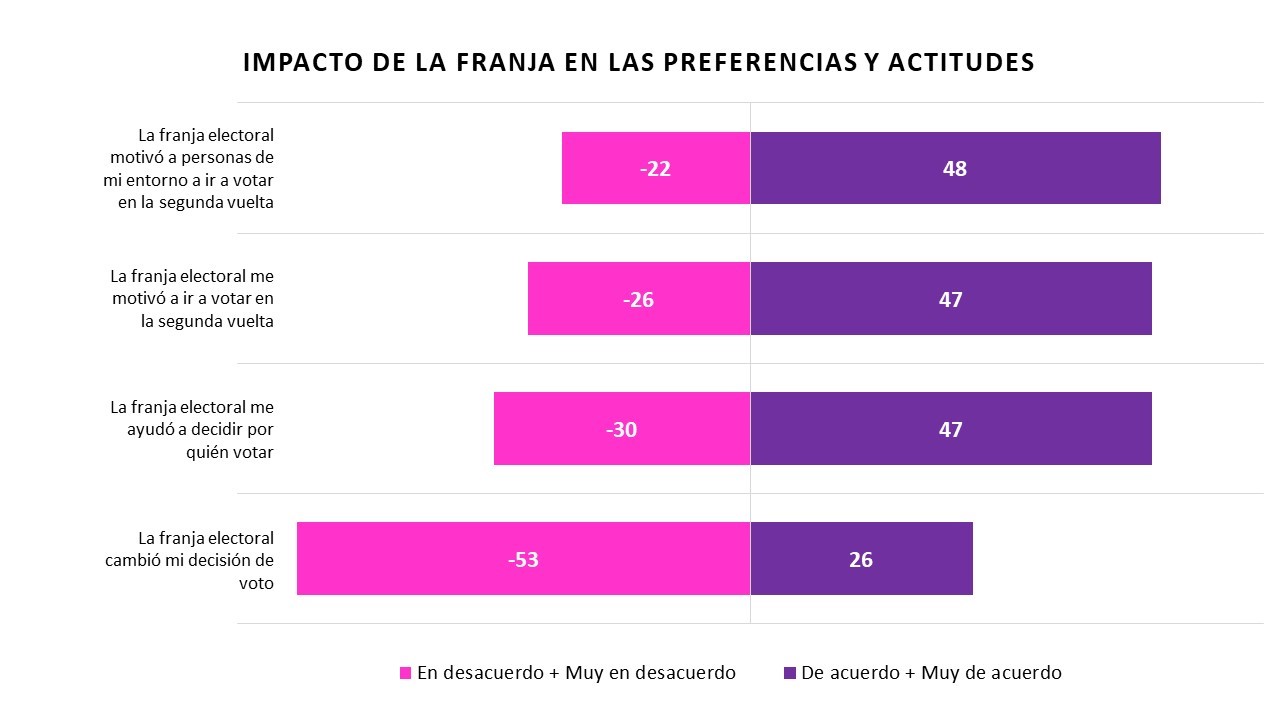 Las diferencias entre las propagandas de cada candidato también fueron reconocidas por las audiencias. La franja de Gabriel Boric fue considerada más clara con 41% por sobre el 36% obtenido por la franja de Kast; además de identificarla como la que atrajo más votos a través de las emociones (45% versus 34%) y la más eficiente en motivar a ir a votar (43% versus 30%).