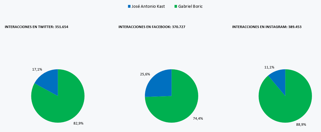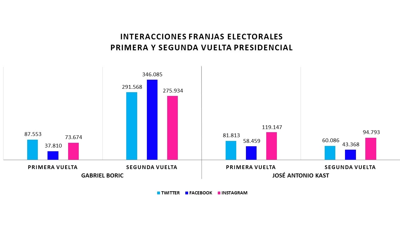 Si bien el candidato José Antonio Kast lideró por sobre Gabriel Boric durante la franja de primera vuelta en interacciones en Instagram, con más de 119 mil y en Facebook con más de 58 mil, para la segunda vuelta cayó a las 94 mil y 43 mil respectivamente. Fue en segunda vuelta donde el candidato Gabriel Boric superó a José Antonio Kast tanto en cantidad de mensajes como interacciones en todas las plataformas.