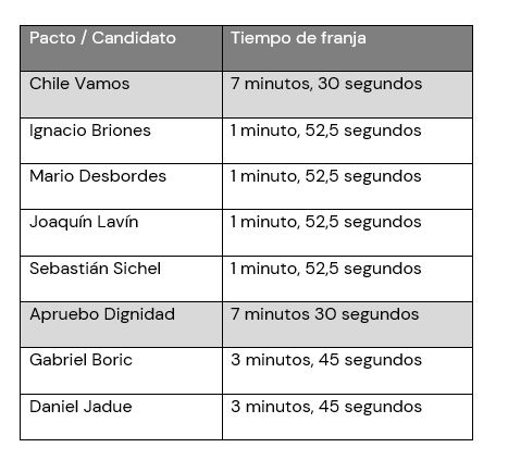 La duración legal de la franja será de 15 minutos divididos en dos bloques de la misma duración, por lo que tanto la coalición Chile Vamos como el pacto Apruebo Dignidad tendrán de 7 minutos con 30 segundos cada uno, los que se distribuirán en partes iguales entre sus respectivos candidatos.