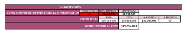 1) Existe un error en el cálculo de Imprevistos: Lo que corresponde por bases es que el porcentaje en imprevistos sólo debe ser calculado en base a lo solicitado al CNTV.