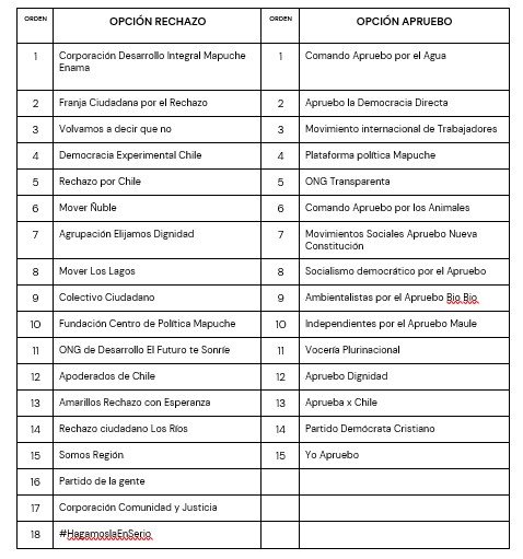 Este viernes 29 se realizó el sorteo del orden de aparición de los participantes y será la opción Apruebo la que abrirá la franja el 05 de agosto a las 12:45. En todas las siguientes emisiones el orden irá rotando, por lo que la franja de las 20:45 del 05 de agosto comenzará con la opción Rechazo. En el sorteo también se determinó el orden interno de cada una de las opciones, quedando ambas emisiones ordenadas de la manera descrita en los siguientes recuadros. Este orden también será rotativo.