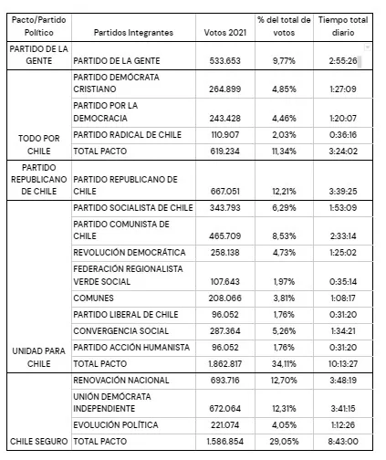 La distribución de los tiempos se realizará según el cuadro presentado a continuación, el que establece el tiempo total diario de cada participante. Dicho tiempo diario, deberá ser dividido en partes iguales para las dos emisiones diarias en televisión, una a las 12:45 y otra, a las 20:45.