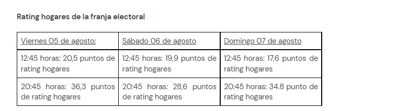 Lunes 8 de agosto de 2022. El Departamento de Estudios del Consejo Nacional de Televisión presentó el día de hoy un primer informe de audiencias de la franja electoral, con datos de Kantar Ibope Media, a tres días de la primera emisión de la franja electoral del plebiscito constitucional.
