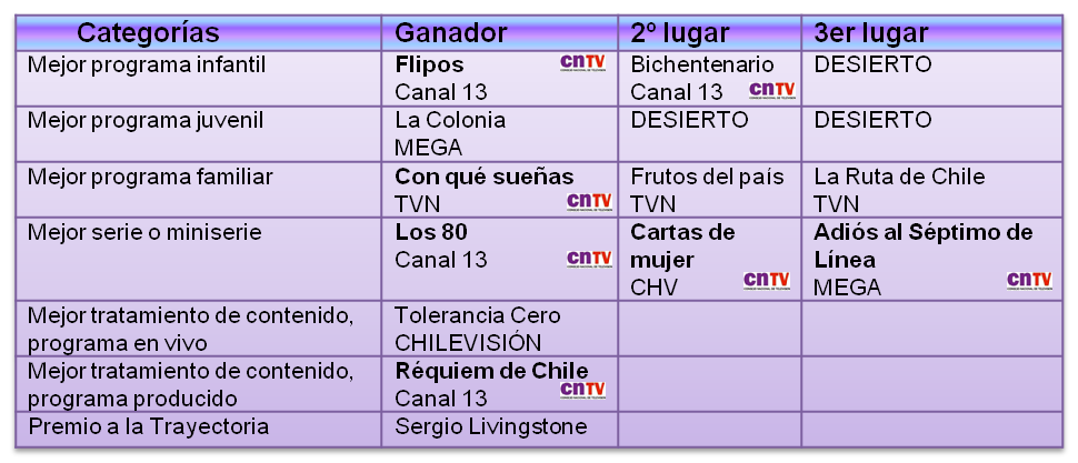 Dentro de la categoría de Televisión, resultaron ganadoras diversas series que obtuvieron un Fondo CNTV para su realización. “La importancia de estos premios se basa en que son los únicos otorgados por un grupo de padres preocupados por los consumos de medios de los niños y jóvenes del país», señaló Alfonso Canales, presidente de Quéveo.
